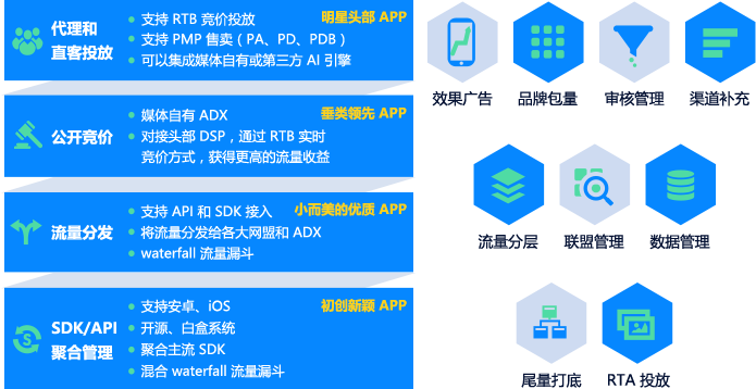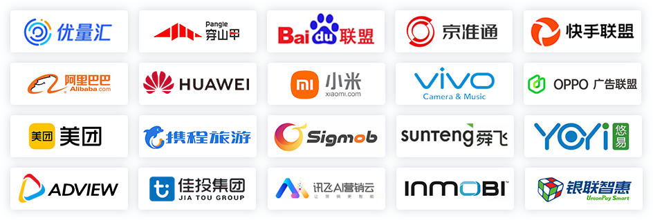 适配全行业 90% 以上预算方接口,一键开通 5 大网盟、4 大厂商、